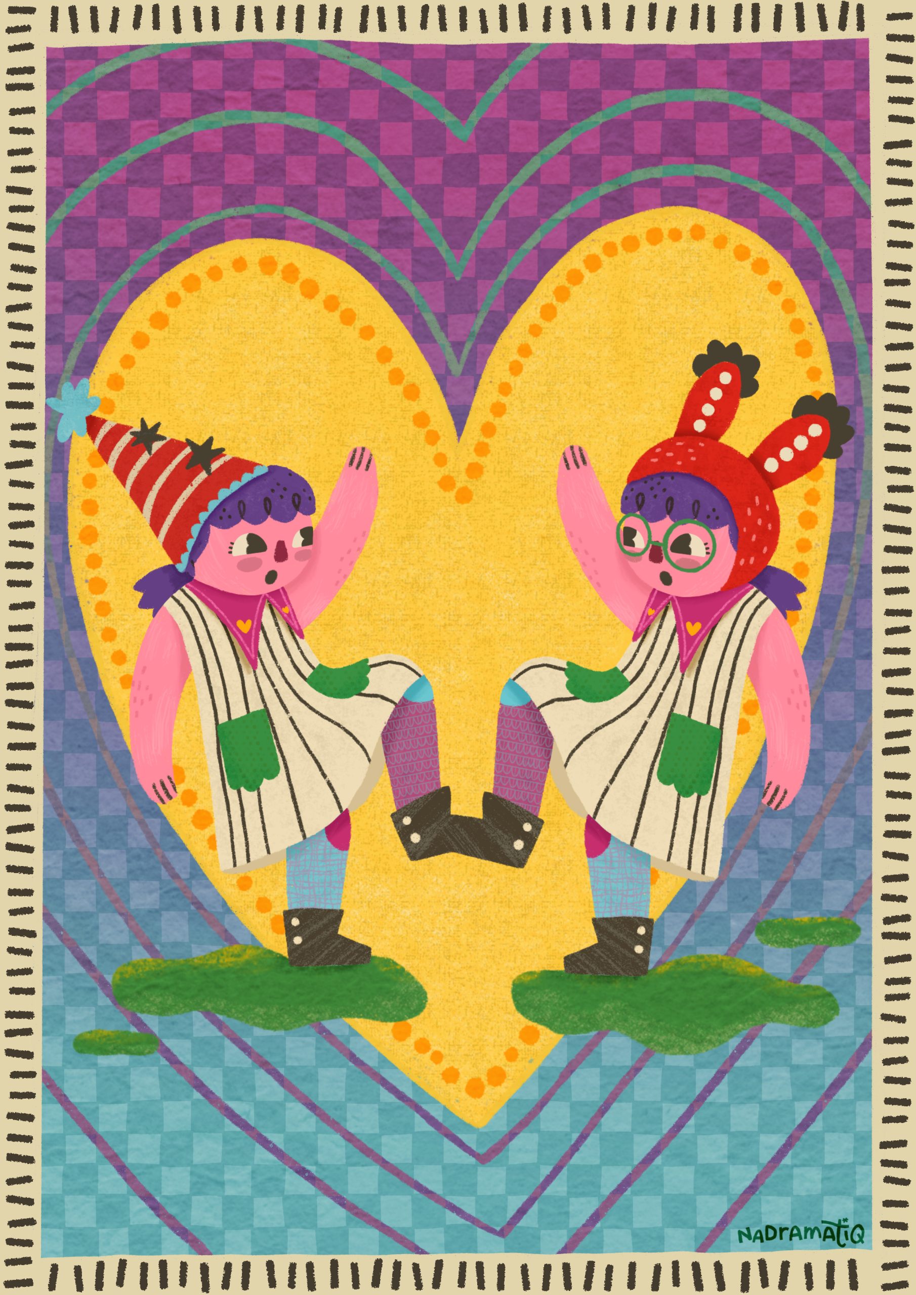 Nadia is the artist behind Nadramatiq, presenting a creative world built on dramatic, playful, and vibrantly expressive characters. Her work draws from the boundless imagination of childhood: a well she’s been able to return to even more freely since becoming a mother, finding fresh wonder in the everyday through her child’s eyes.