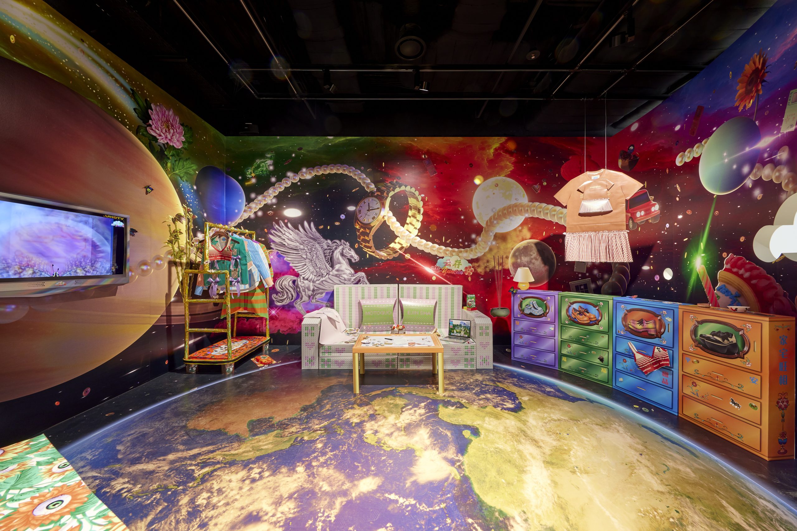 Ejin Sha’s art tends to resist a fixed style; she is instead guided by curiosity and a need to make sense of things, such as relationships, histories, and identities that feel distant or difficult to hold. Each work becomes a kind of translation, moving between memory and form, presence and absence. She works across a wide range of materials, from mass-consumed surfaces like paper and tarpaulin to more intimate ones like clay and resin, and is often drawn to how materials carry cultural memory, especially those connected to display, ritual, and everyday life. Her latest project, Are You Living or Leaving? (created in collaboration with motoguo for Cloud Walkers at Leeum Museum of Art, Seoul, 2023) and Celestial Mall for How Do We Shop at Singapore Design Week 2025 explores zhizha methodologies to recreate spaces as symbolic offerings, from aspirational domestic interiors (such as a living room in the clouds) to retail environments. Her parallel practice as a graphic designer helps shape her artistic thinking. Identity, to her, is never fixed, but performed, projected, and constantly renegotiated. That tension between preservation and invention is what drives her work forward.