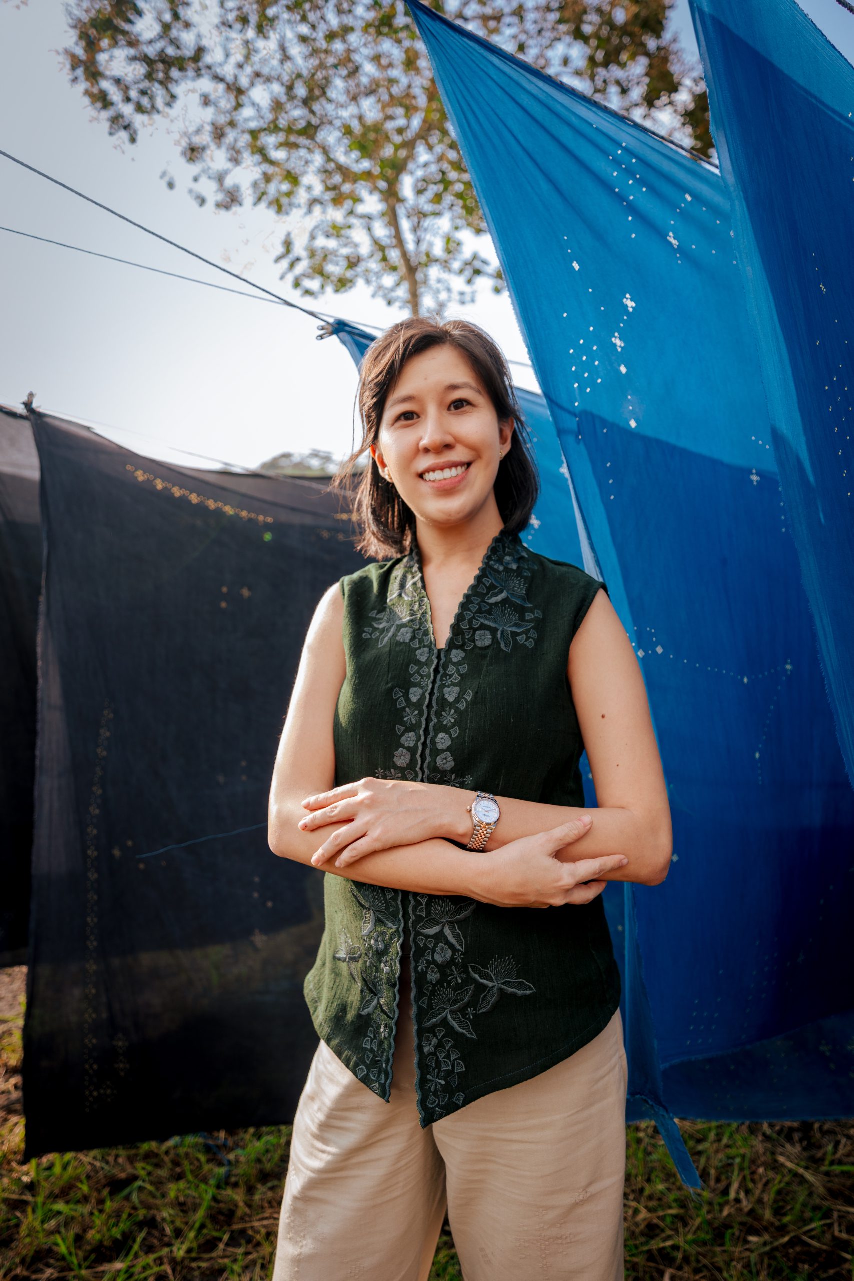 Today, SukkhaCitta partners with hundreds of Indonesian farmers and artisans on Java and neighbouring islands like Bali, Flores, and West Timor. Riadini-Flesch’s work and her outfit that morning tell the same story: garments dyed with natural indigo, woven by hand, shaped not by machines but by the rhythm of human care. As she stands among the trees, she gestures to the leaves around her. “This,” she says, “is a fashion forest.”