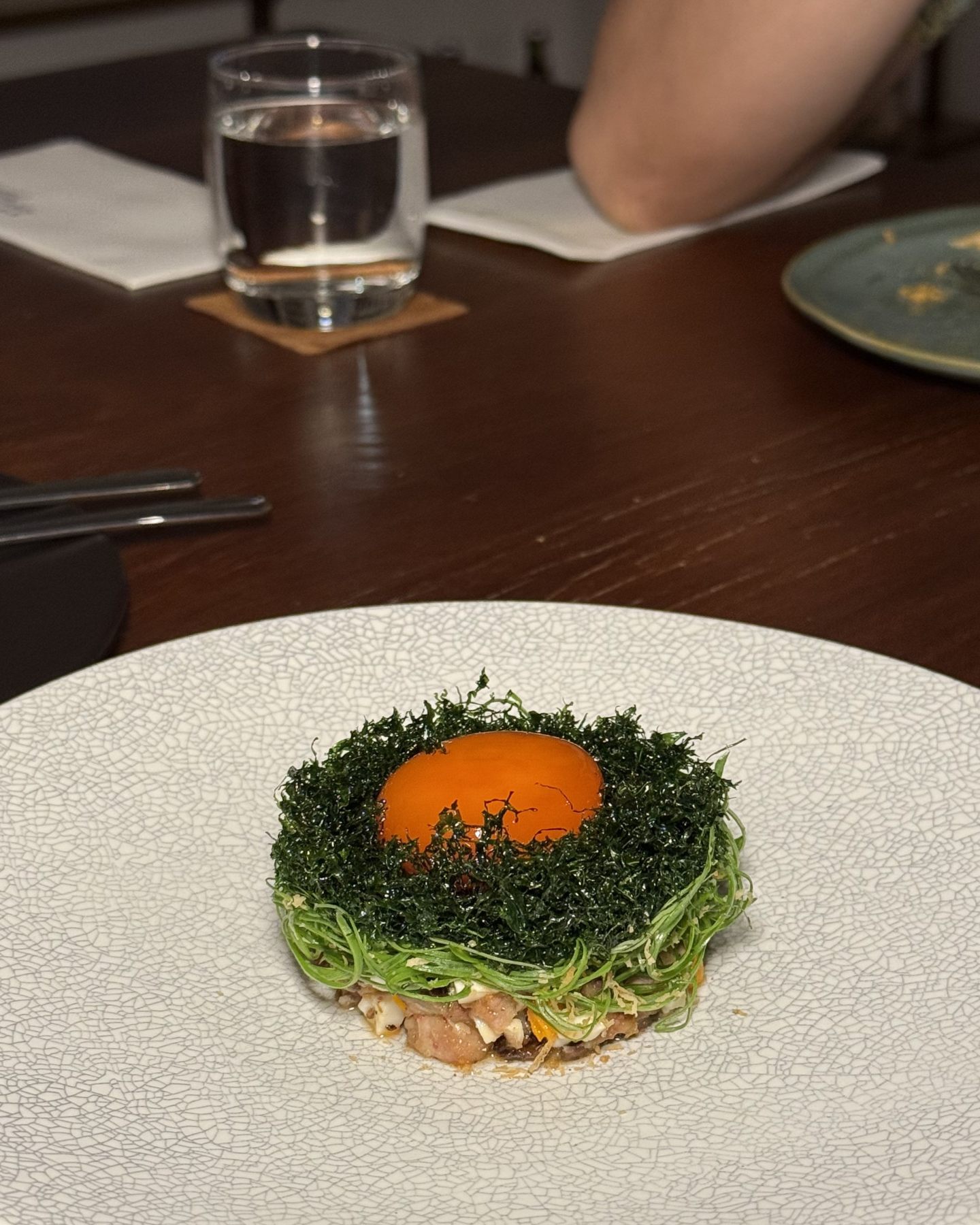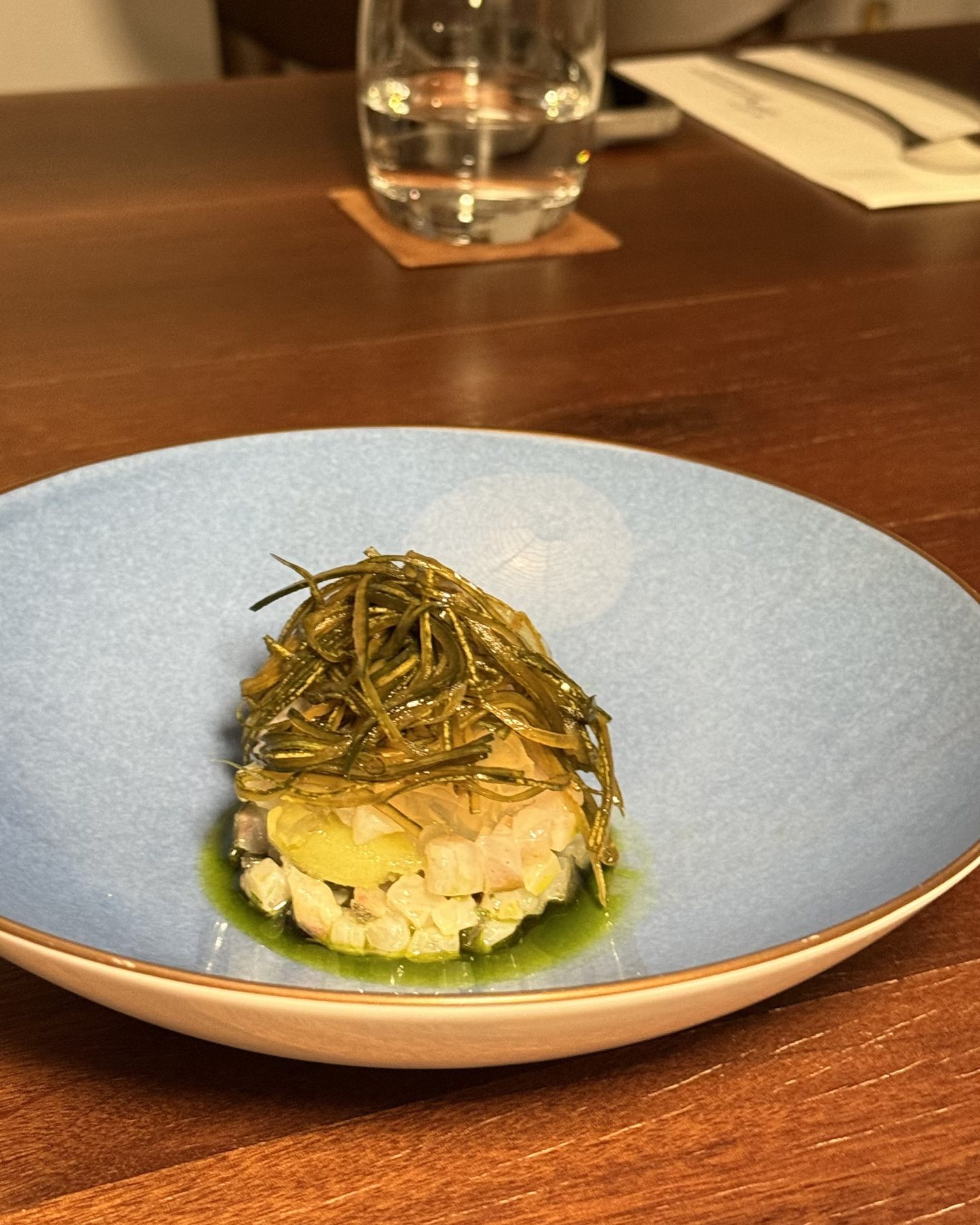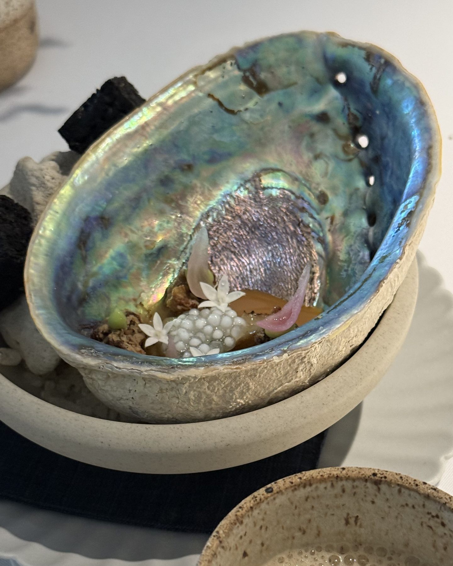During our time there, we opted for the degustation menu and were served a beautiful course ranging from cabbage interpreted several ways to East Malaysia-sourced seafood. The Semporna Sea Harvest course, for instance, felt like the ocean served in an abalone shell—quite literally, the ceramic dish was lined with mother-of-pearl—and contained the riches of the sea: sea cucumber, abalone, served with vin jaune sauce and squid ink focaccia.