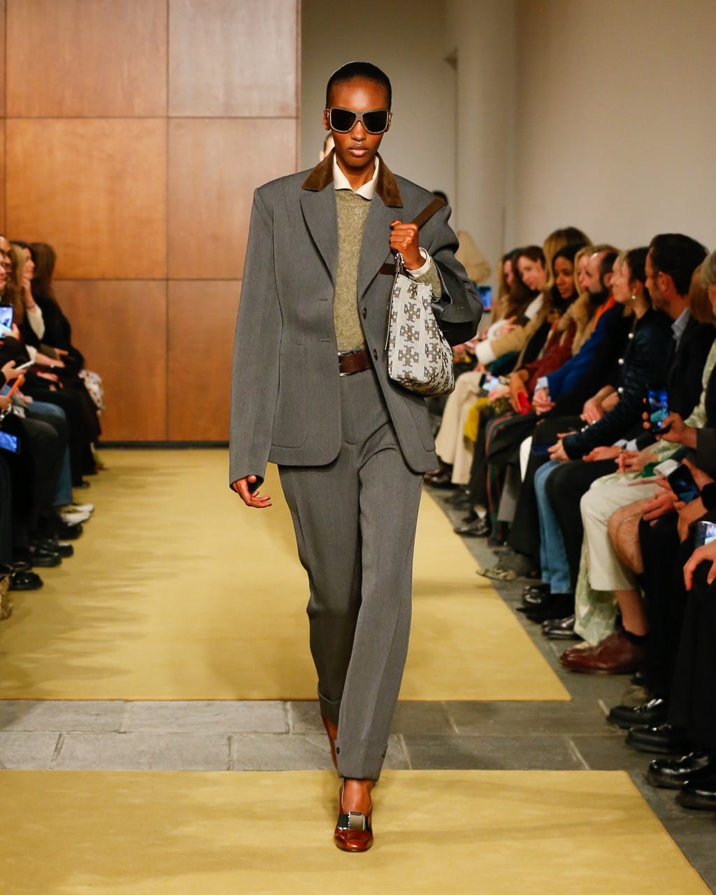 Everyone was calling it a Toryssance last fall, and with her Fall/Winter 2026 showing, there’s little doubt that the Tory Burch revival is still going strong. The American designer recently stepped down from CEO duties to focus solely on her role as creative director of the brand, and she has been fullthroatedly embracing the freedom that brings. The most recent result is a collection of classics that are rich in craftsmanship and detail. An East-meets-West theme emerged: think a trench coat with gold detailing reminiscent of Chinese lacquer paintings, and knit cardigans featuring badla embroidery hand-done by Indian artisans. And those colours—lush saffrons, deep apricots, and midnight blues that jump off the screen. On the accessory front, Burch introduced the Bunny knot on quilted handbags, a symbol of unity inspired by American horticulturist Bunny Mellon.