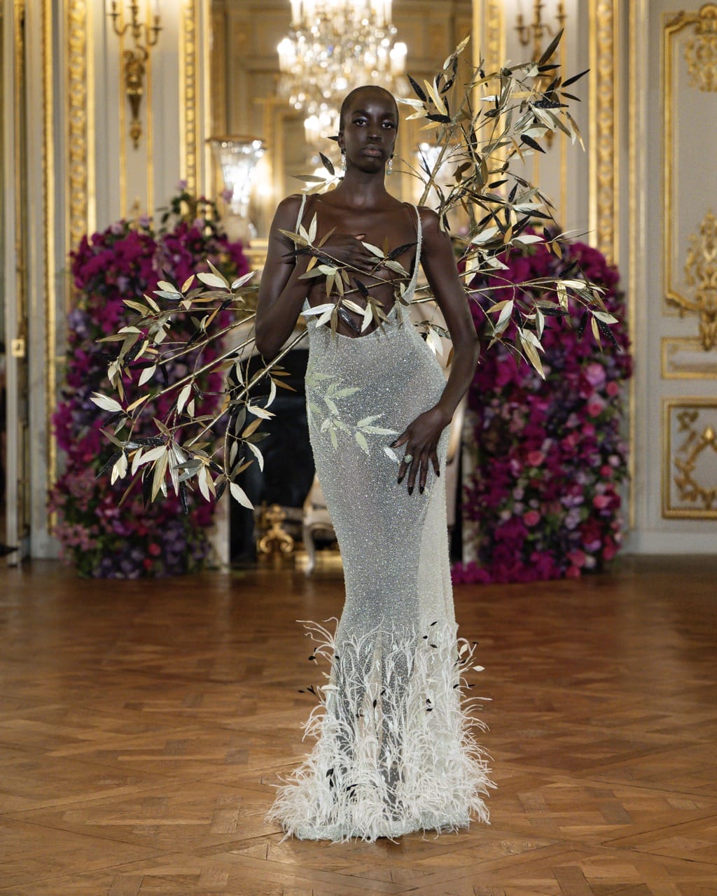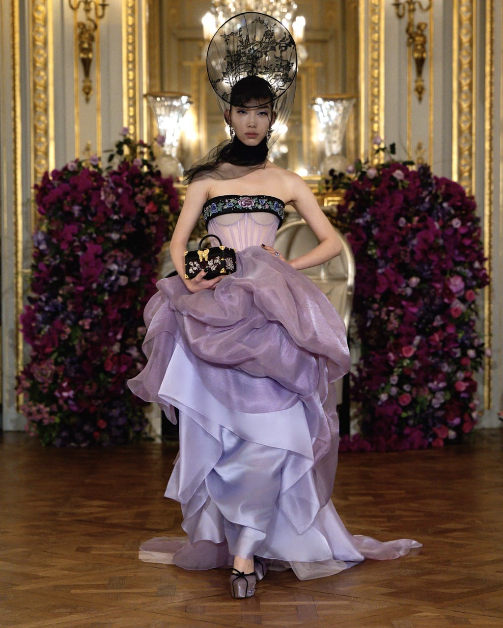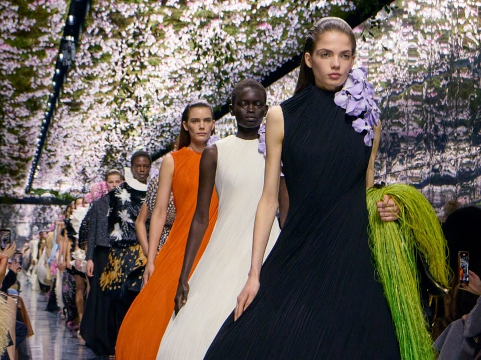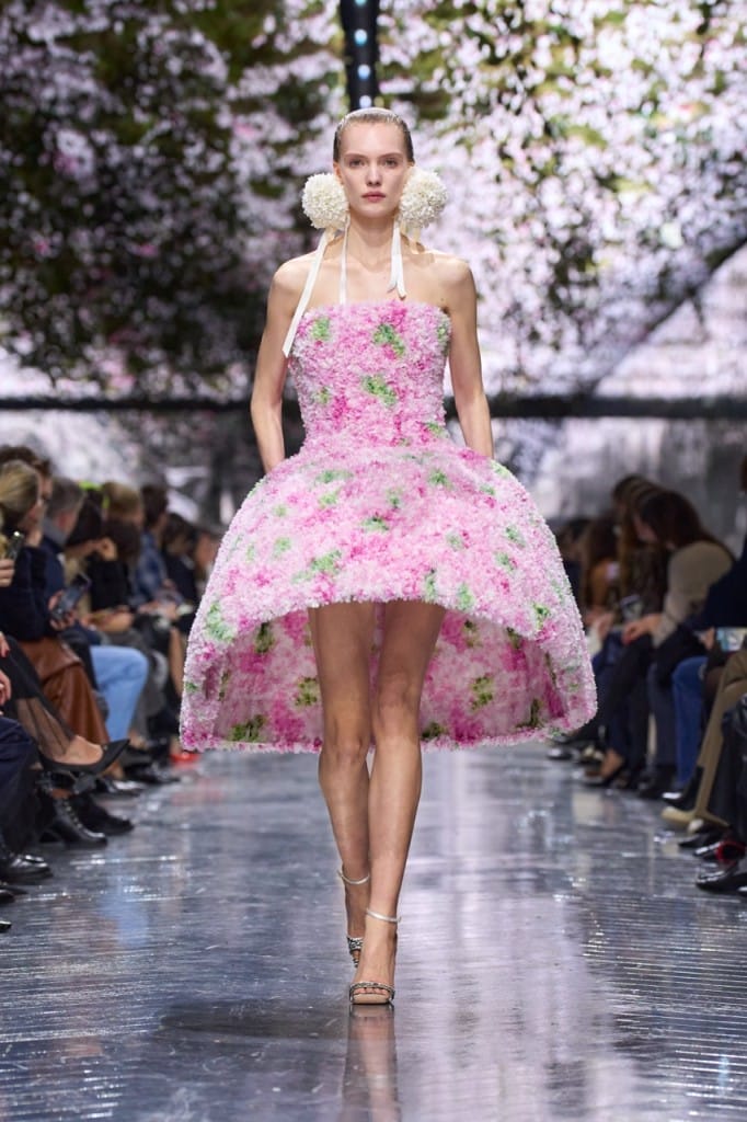 For Jonathan Anderson at Dior, it was about putting his own creative stamp on a rich legacy. The collection was striking in its exploration of silhouette and texture, showcasing draped silk, feathery chiffon petals, and gowns that ballooned out at the hem. Florals were everywhere, with cyclamens blanketing the ceiling and the runway looks alike. Anderson was in a clear dialogue with Dior’s past, yet unafraid to make his own mark on it.