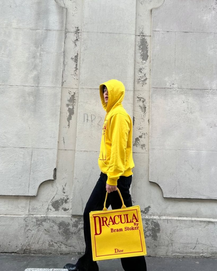 On that note, the Dior Book Tote made its glorious comeback, and the Book Cover Tote has been the talk of the town for a while now—especially the Dracula by Bram Stoker in striking yellow. Mingyu of Seventeen couples his tote bag with a matching hoodie, toning the yellow-on-yellow down with a pair of humble black jeans.