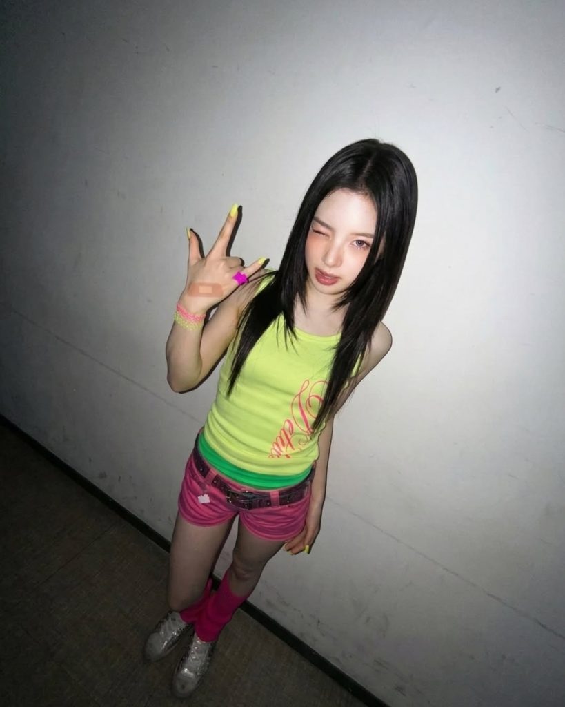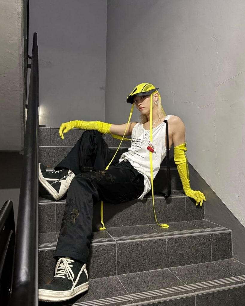 As 2000s fashion lines up for a revival—think trucker caps, micro-miniskirts and, of course, neon—leave it to the freshly debuted K-pop sensation to ride the fluorescent wave, because how could Kiiikiii‘s stage outfits not steal your attention? Donning a neon sleeveless top layered over luminous green and radioactive pink shorts that clash, Kya channels the aughts’ vivacity that reigned on stage two decades ago for the group’s “Delulu” performance. We aren’t the ones calling for this resurgence; the trendsetters are. If that highlighter hue feels too brash—or too Jane Fonda—for your liking, an accessory is always the best solution. With yellow, it’s go bold or go home. Felix of Stray Kids, for example, with his head-turning yellow headwear (which also doubles as gloves), is one for the street style books.