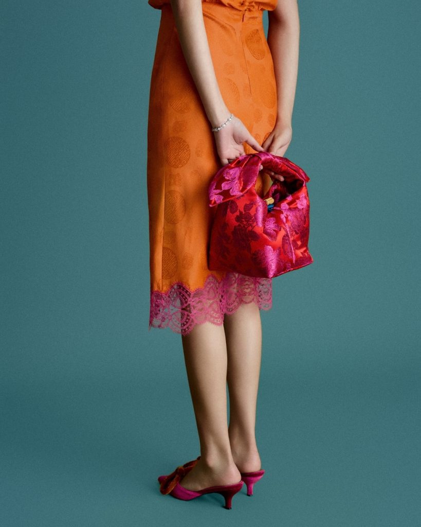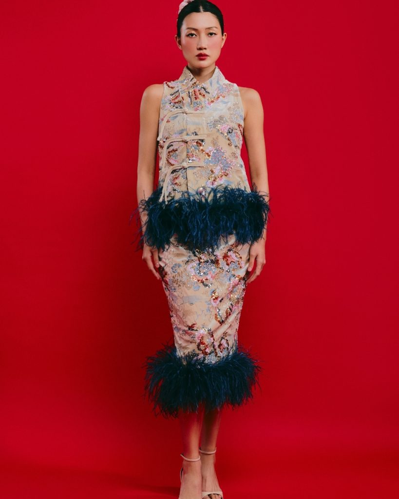 The standout pieces on our list are the Lei Lei Skirt and the Sally cheongsam. The former is a tiered midi skirt crafted with floral embroidery that transitions from a soft shade of budding roses to bright red, big blooms. The Sally cheongsam, on the other hand, is a modern approach to the traditional garment, covered with intricately made laces in a soft pastel palette that cascade in chevrons.