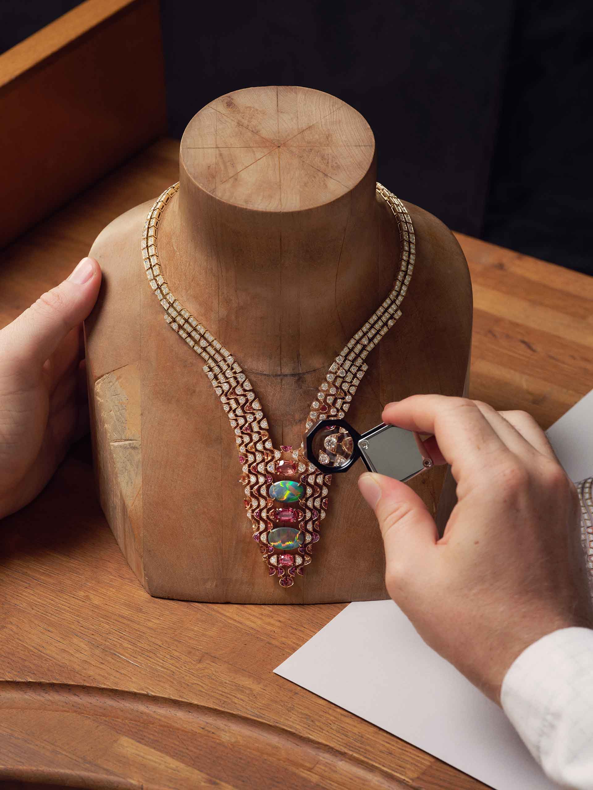 From there, the Cafayate necklace travelled through the high jewellery workshop, where jewellers, lapidaries, setters and polishers shape ideas into precious material. Its silhouette—an elegant, V-shaped cascade—was first sculpted in clay and wax. “There are certain volumes you simply cannot imagine in two dimensions,” Abitbol explains. Weekly meetings with designers refine the articulation, the movement, and the interplay of curves.