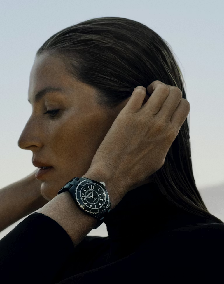 In 2026, the J12 feels neither retrospective nor nostalgic. Instead, it returns to its origins with sharpened clarity. The new campaign underscores the material’s unexpected sensuality and the watch’s innate versatility, equally at home in salt air or city light. On Bündchen, it reads as instinctive: strength held in tension with ease; precision offset by fluidity.