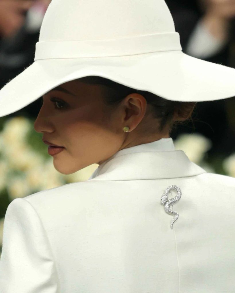 At this year’s Met Gala, Zendaya sealed its return. Styled by Law Roach in a sharp Louis Vuitton suit, she wore a sinuous Bvlgari serpent brooch pinned between her shoulder blades—daring and unforgettable. Co-chair Lewis Hamilton added baobab-inspired Snow Diamonds brooches, while Lupita Nyong’o chose a floral Chanel pin, Ayo Edebiri accented Ferragamo with gold, and Anna Wintour traded her signature sunglasses for an antique Lydia Courteille piece.