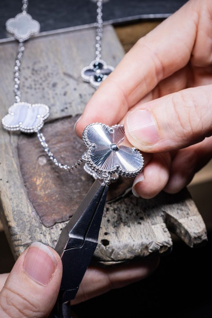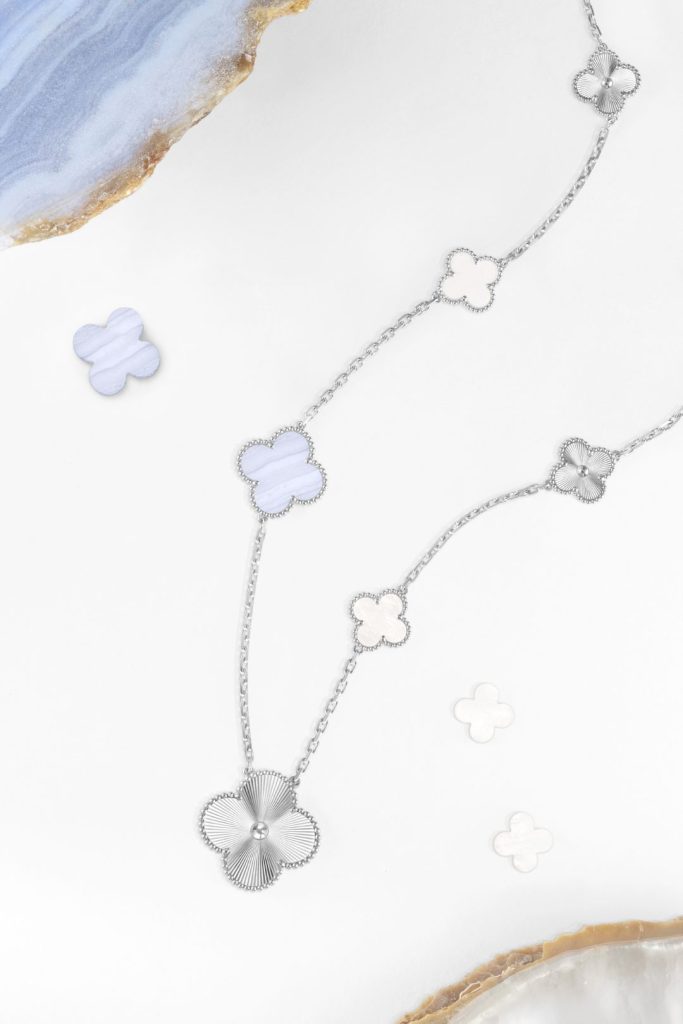 Even after all these years, each new stone or shade feels like a fresh chapter. A different colour can give the whole collection a new personality. This time, the family of rings, bracelets, a watch, and necklaces is built around the four-leaf clover, edged with tiny gold beads. Now one is set in guilloché rose gold with white and grey mother-of-pearl. The other is guilloché white gold with chalcedony and white mother-of-pearl, giving a cool, luminous finish.