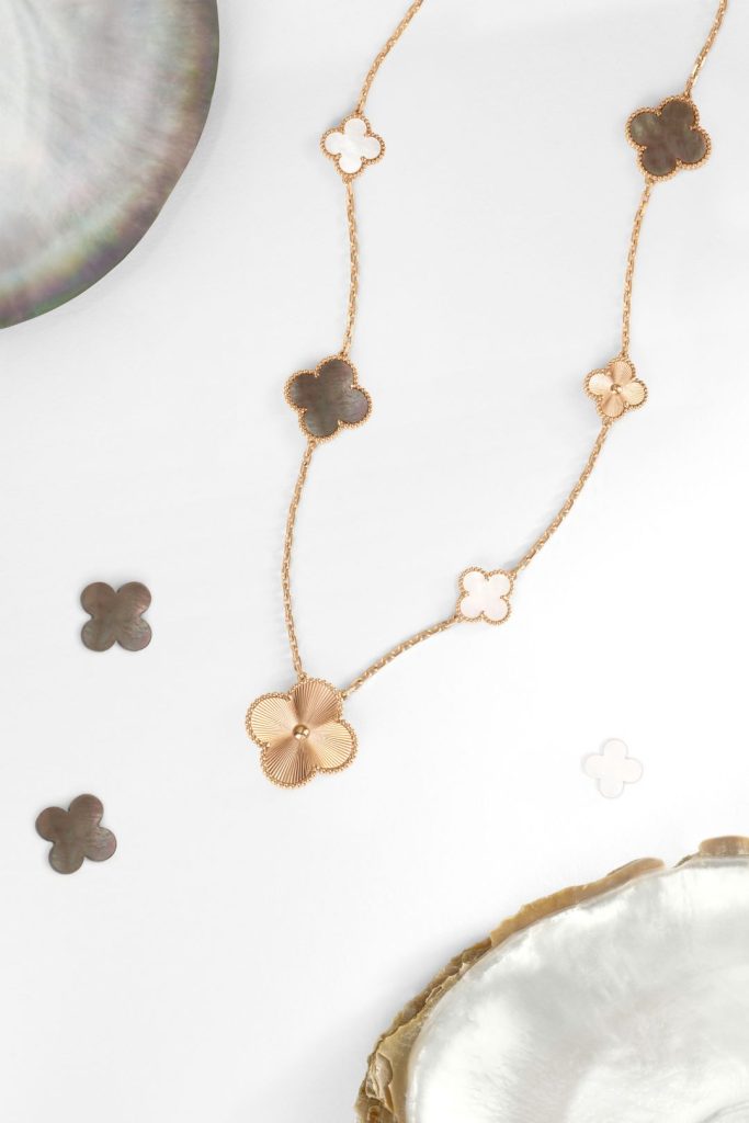 Magic Alhambra arrived in 2006 and marked the first time the maison played with different clover sizes. The new collection continues the idea of mixing motif sizes, which started with Magic Alhambra in 2006, but this time adds transformability—a long necklace that becomes a short necklace, and then a bracelet, thanks to hidden clasps. It’s the first time this feature has appeared in an Alhambra piece.