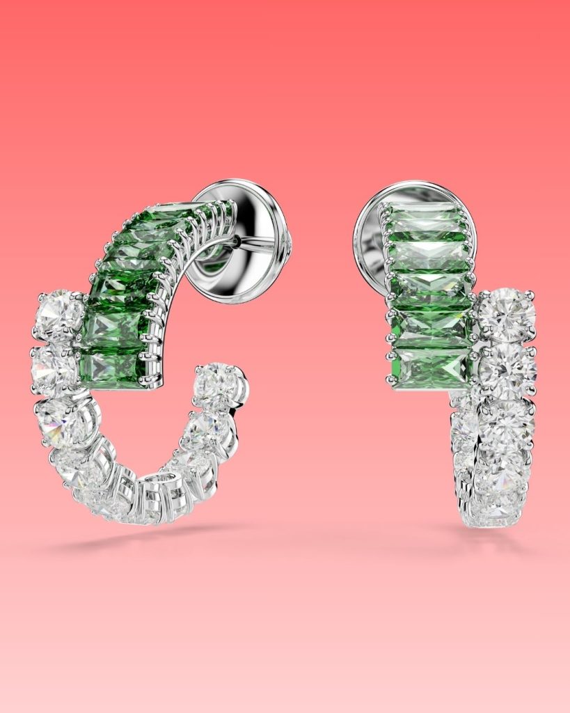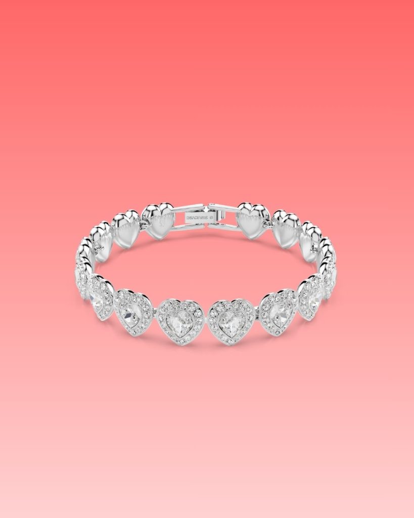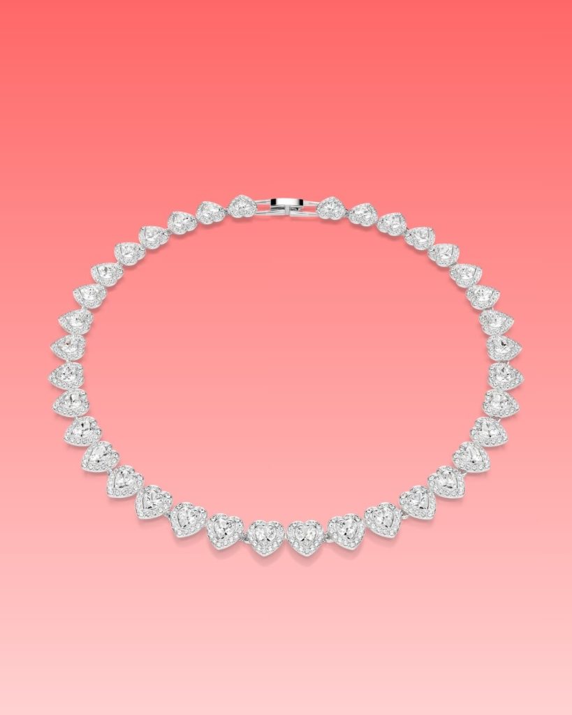 This collection celebrates love, romance, joy, and the art of light. Co-created with Ariana Grande and Swarovski Global Creative Director Giovanna Engelbert, each piece radiates modern elegance and joyful self-expression. The rhodium-plated designs feature a full circle of heart-shaped crystals, each surrounded by a glittering halo of clear pavé. Mix and match to create your own dazzling combinations.